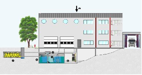 | (4) Overflow siphon designed for the evacuation of floating substance | (5) Suction under water surface | (6) Management station supplying the needs: sanitary facilities, faucet, process water, fire reserves |