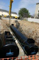 | Exemple de mise en oeuvre (300 m3) pour remplacer un bassin d'orage à ciel ouvert au centre d'un lotissement, jugé dangereux, inesthétique, et apportant des nuisances (moustiques, odeurs). Une fois terminé le site sera aménagé en parc public avec jeux pour les enfants (Nantes). |